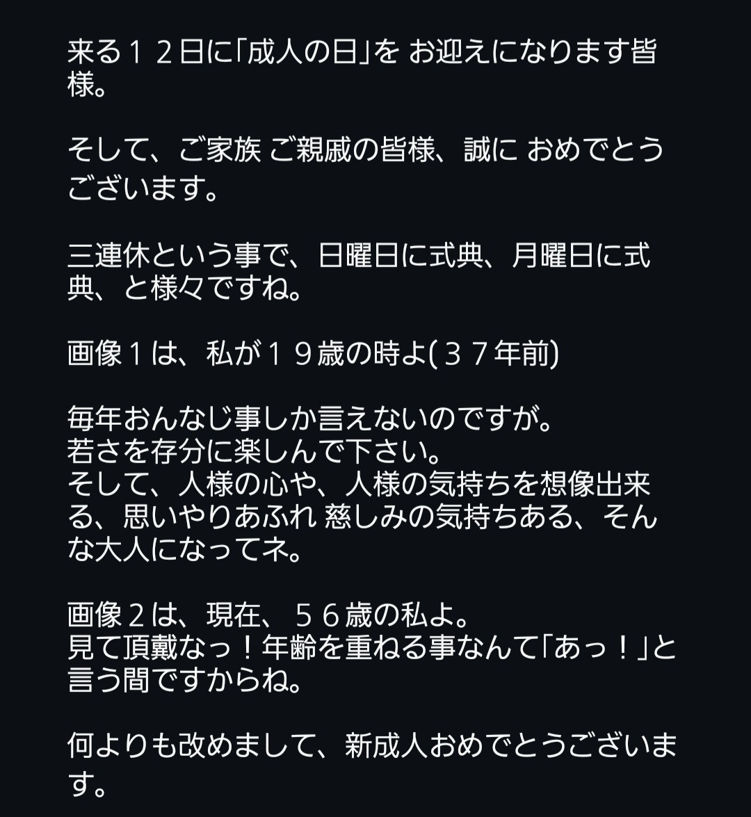 2026.01.10(土) 19:30メッセージ, 日記成人おめでとうございます, 成人の日2026, 成人式トオル